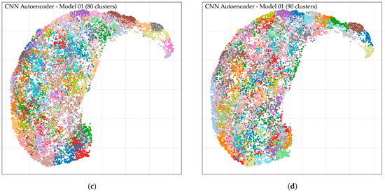 The performance of UMAP-based clustering was evaluated under multiple cluster configurations, with Figure 8 showing visualizations for 60, 70, 80, and 90 clusters. At k = 60, clusters appeared broad and heterogeneous, with several categories overlapping. At k = 70, group separation improved, but some clusters still contained ambiguous regions requiring further resolution. At k = 80, clustering achieved the clearest partitioning, producing well-defined groups with balanced granularity and reduced overlap across categories. Dataset 1 and Dataset 2 both exhibited clear separation at this configuration, with visual clusters showing minimal mixing between different morphologies. At k = 90, clustering revealed finer details, capturing elongated and irregular cells more distinctly, but the number of clusters increased and redundancy became more evident. Overall, the UMAP projections demonstrated that k = 80 produced the most stable and interpretable cluster distribution across both datasets, as visualized in Figure 8.