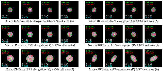 Ellipse fitting was applied to clustered cells to quantify RBC geometry, producing standardized measures of size, elongation ratio (R), and ellipse-to-boundary ratio (A). These descriptors enabled consistent assessment of morphological variation across datasets. The fitted ellipses provided reliable estimates of cell dimensions, distinguishing microcytic cells (<6.00 µm), normocytic cells (6.00–8.00 µm), and macrocytic cells (>8.00 µm). Elongation ratios further separated round cells from moderately elongated oval cells and highly elongated pencil-shaped cells. The ellipse-to-boundary ratio additionally differentiated well-fitted cells from incomplete or irregular boundaries, ensuring that only high-quality representations were retained. Representative outcomes of this stage are shown in Figure 9, where annotated examples illustrate categories based on size, elongation, and fitted area. The figure demonstrates that the algorithm generated clearly distinguishable cell groups, providing systematically defined morphological examples for subsequent expert validation and classification. These results indicate that ellipse fitting produced coherent geometric descriptions across clusters.
