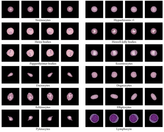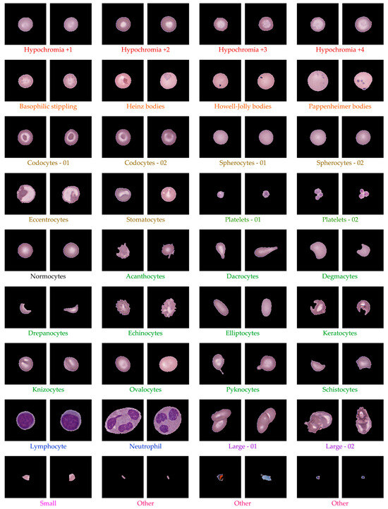 After ellipse fitting, the clustered data were organized into 80 groups and subsequently classified into established RBC morphologies using hematology references [52,53,54]. Two hematology experts independently reviewed all clusters, verified morphological consistency, and reassigned labels when necessary. The validation process produced a reliable classification covering a wide spectrum of morphologies. Table 5 summarizes the distribution of 14,089 single-cell images across categories including normocytes, hypochromic cells, codocytes, spherocytes, dacrocytes, elliptocytes, drepanocytes, and other abnormal forms, as well as leukocytes and platelets. The largest groups were hypochromic cells and spherocytes, each exceeding 20% of the dataset, while rare forms such as Howell–Jolly bodies (0.34%), Heinz bodies (0.01%), and drepanocytes (0.18%) were also identified. Figure 10 illustrates representative examples of validated morphologies, including target cells, teardrop cells, and schistocytes. The validation process produced a dataset containing clinically diverse red blood cell morphologies, providing reliable and well-structured samples suitable for analysis.
