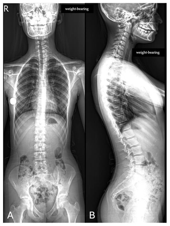 Full-spine radiographs were acquired in standing position using the same dedicated scanner (Bloomix 120 ED-R). (A) Anteroposterior (AP) view; (B) lateral view. For each patient, AP and lateral projections were obtained from the base of the skull to the last sacral segment, including the hip bones and femoral heads. The scanner enabled the acquisition of the entire spine in a single shot, without the need for image stitching.
