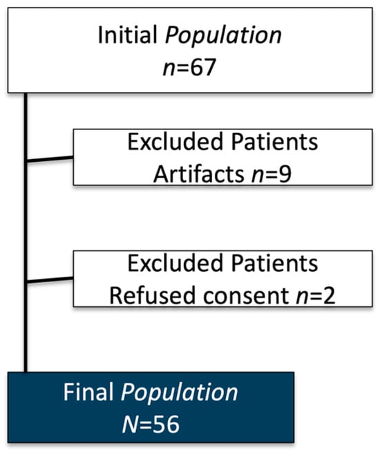 From an initial population of 67 patients, a total of 56 were included in the study (21 males, 35 females). The participants had a mean age of 33.65 ± 24.51 years (range 7–74 years). Among the included subjects, 23 were underage patients. Images with severe artifacts (n = 9) and patients who refused to provide informed consent (n = 2) were excluded from the analysis. Pathological findings were detected in 49/56 patients (87.5%). Specifically, scoliosis was found in 16/56 patients (28.6%), spondylolisthesis was found in 4/56 patients (7.1%), and a vertebral collapse was identified in 1/56 patient (1.8%) (Figure 2).