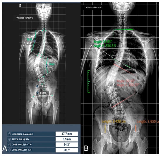 Image analysis of Cobb angle and pelvic obliquity in the same patients. (A) Automated measurements; (B) radiologist measurements.