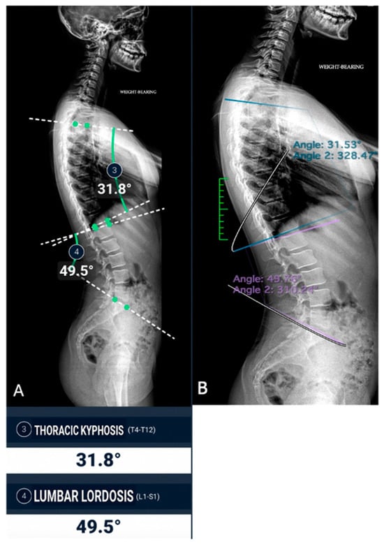 Sagittal spine image analysis in the same patient. (A) Automated measurements of thoracic kyphosis (T4–T12) and lumbar lordosis (L1–S1); (B) manual measurements performed by a radiologist.