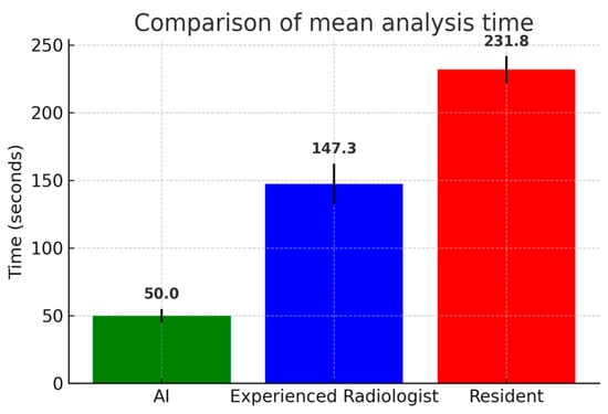 Analysis time was significantly shorter for AI vs. the experienced radiologist (50.00 ± 0.00 s vs. 147.34 ± 18.78 s, p < 0.001) and for AI vs. the radiology resident (50.00 ± 0.00 s vs. 231.78 ± 20.15, p < 0.001). Analysis was significantly faster for the experienced radiologist vs. the radiology resident (147.34 ± 18.78 s vs. 231.78 ± 20.15, p = 0.027) (Table 3) (Figure 5).