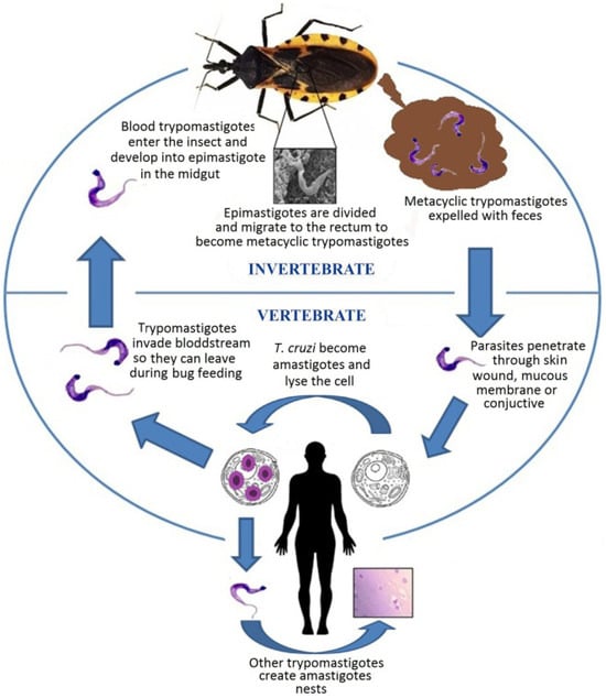 - Tyler, K.; Engman, D. The life cycle of Trypanosoma cruzi revisited. Int. J. Parasitol. 2001, 31, 472–481. [Google Scholar] [CrossRef]