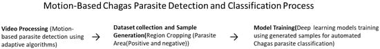 Motion-based Chagas parasite detection and classification framework. The process comprises video preprocessing, candidate region extraction, sample generation, and deep learning model training.