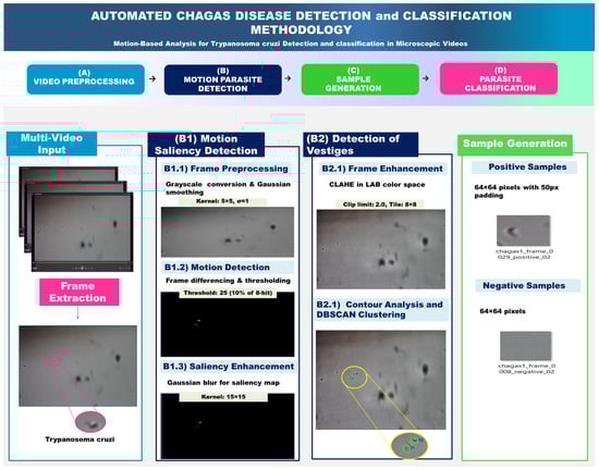 Comprehensive pipeline for automated Trypanosoma cruzi detection and classification. This diagram outlines the four key stages of a motion-based analysis methodology for identifying and classifying Trypanosoma cruzi parasites from microscopic video data. (A) Video Preprocessing extracts frames from multi-video input. (B) Motion Parasite Detection uses a two-part approach: (B1) Motion Saliency Detection identifies moving objects, and (B2) Detection of Vestiges refines these detections using frame enhancement and DBSCAN clustering. The detected parasites are then used in (C) Sample Generation to create a balanced dataset of positive and negative samples (e.g., 64 × 64 pixel images) for subsequent machine learning. This dataset is then used in (D) Parasite Classification to train a model for the automated diagnosis of Chagas disease.