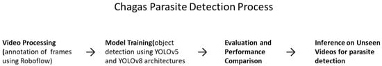 As illustrated in Figure 2, the proposed Chagas parasite detection framework comprises four key stages: video processing, model training, evaluation, and findings.