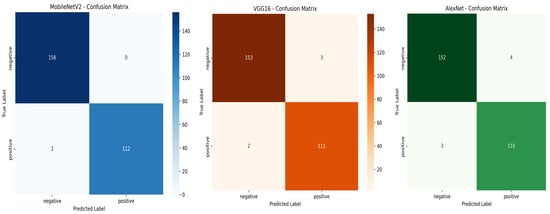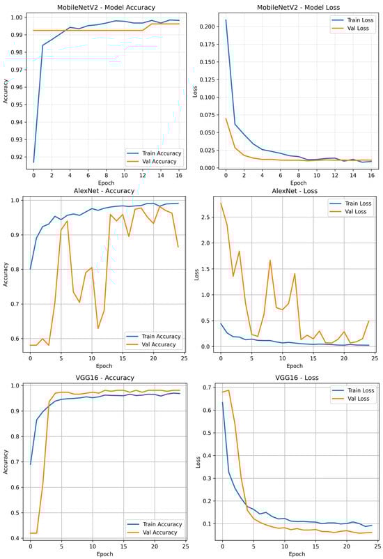 We trained and evaluated three deep learning models for binary classification of parasites: MobileNetV2 [], AlexNet [], and VGG16 []. Each model was selected to represent a different family of convolutional neural networks (CNNs), balancing between efficiency, depth, and feature extraction capabilities. All models took RGB images resized to as input, with pixel values normalized between 0 and 1. The training used a batch size of 32 and the Adam optimizer with a learning rate of 0.0001. We used binary cross-entropy as the loss function, and training was limited to 25 epochs. Early stopping was used with a patience of 7 epochs to avoid over-fitting if validation loss did not improve.