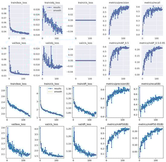The performance of the trained models was evaluated using widely accepted object detection metrics, including precision (P), recall (R), mean Average Precision at IoU threshold (mAP@), and mean Average Precision averaged over IoU thresholds from to (mAP@). These metrics provide a comprehensive view of the model’s localisation accuracy and its robustness across different levels of detection strictness. Table 11 summarises the detection performance of all YOLO variants on the validation dataset.