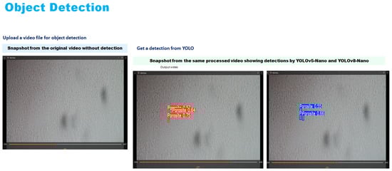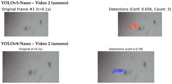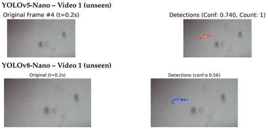 The best-performing models, YOLOv5-Nano and YOLOv8-Nano, were selected for this qualitative assessment based on their superior performance during the quantitative evaluation phase. Both models underwent inference testing on the unseen video datasets to evaluate their generalisation capabilities and real-world applicability. Both models successfully detected and localised multiple parasite instances, demonstrating robust performance even under challenging conditions such as motion blur, variable lighting, and cluttered or noisy backgrounds. The detection results showed strong consistency across different frames and time intervals, indicating good temporal stability of the detection system.