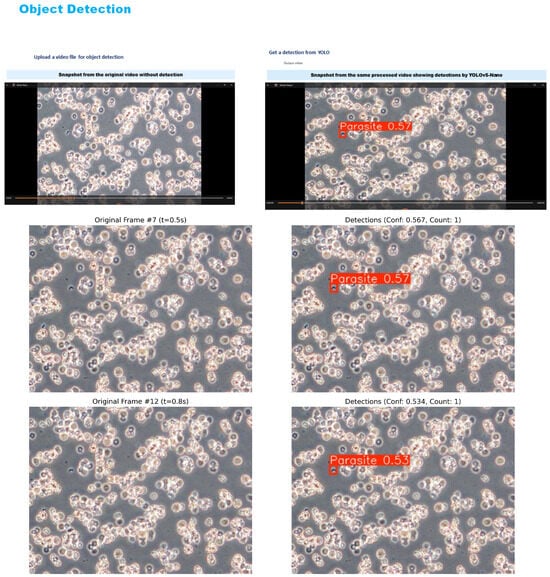 In both test cases, the models were evaluated on video frames with similar visual challenges, such as low contrast and background noise. This comparison highlights how each model architecture performs under identical or near identical conditions, providing insights into their generalisation capabilities on unseen microscopic sequences. While a few missed detections were observed in frames with low contrast or poor visibility reflecting known challenges in the dataset, these instances were relatively infrequent and did not substantially affect overall detection performance. The system demonstrated strong qualitative results, with most detections appearing visually accurate and consistent with expert expectations.