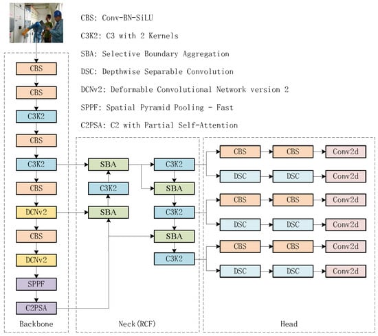 In this section, the structure of the YOLO-DCRCF algorithm will be introduced. Building upon YOLOv11, the algorithm incorporates the second version of the deformable convolutional network (DCNv2) [] and the RCF network architecture [], thereby forming a novel detection algorithm for safety helmets and glove wearing. The overall framework of the algorithm is depicted in Figure 2.