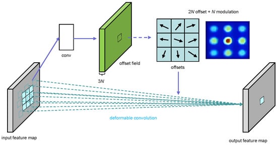 DCNv2 addresses the shortcomings of DCNv1 [] in two primary aspects. First, it introduces additional convolutional layers capable of learning offsets, allowing the network to manage sampling across a broader range of feature levels. Second, it introduces a modulation mechanism that enables each sample to be subject to both learned offsets and modulation by learned feature amplitudes, thus enhancing the network’s capacity to manipulate spatial support regions.