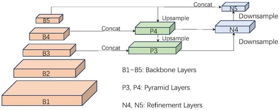 In the field of deep learning for computer vision, the feature pyramid network (FPN) is a widely adopted method for multi-scale feature fusion, with its architecture depicted in Figure 4. However, the traditional FPN structure has inherent limitations, including insufficient semantic information in shallow features, which causes detail loss in deep features, leading to localization errors and false negatives due to intra-layer spatial information loss and semantic disparities between layers []. High-level semantic information in the FPN becomes diluted during downward propagation, and the diverse semantic requirements of different scale layers limit lower layers to accessing only minimal semantic information. Concurrently, the absence of spatial information in high-level features hinders accurate bounding box localization. The dilution of low-level semantic information combined with the deficiency of high-level spatial information results in an information imbalance across the feature pyramid, thereby diminishing the network’s overall performance.