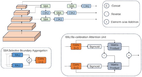To address these challenges, the present study introduces a novel recalibrated feature pyramid network (RCF network) that integrates a Selective Boundary Aggregation (SBA) module to selectively aggregate boundary and semantic information, thereby enhancing feature interactions []. The SBA module facilitates information transmission via bidirectional fusion of high- and low-resolution features, leveraging the semantic information of deep features to enhance the capability of shallow features in recognizing complex objects while utilizing the detailed information of shallow features to improve object boundary delineation and the resolution of deep features. The bidirectional fusion mechanism ensures comprehensive information transfer between features, thereby improving the effectiveness of multi-scale feature fusion. Furthermore, the SBA module dynamically adjusts feature weights based on the diverse resolutions and contents of feature maps, thereby enabling more effective capture of the target’s multi-scale features.