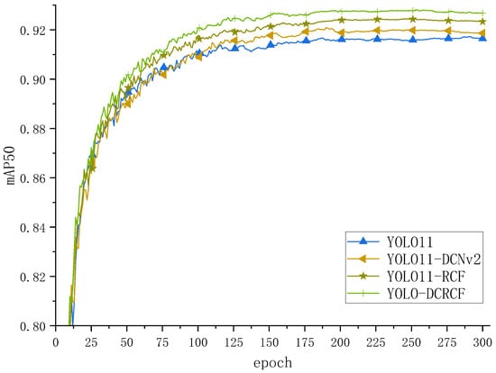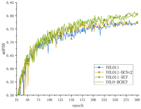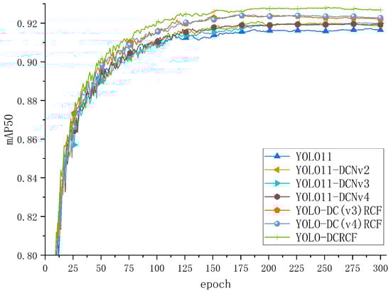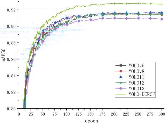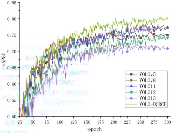 This method effectively mitigated evaluation bias caused by the randomness of data partitioning and ensured the statistical reliability of the experimental results. The mAP50 curves during the training process for various models are illustrated in Figure 6:
