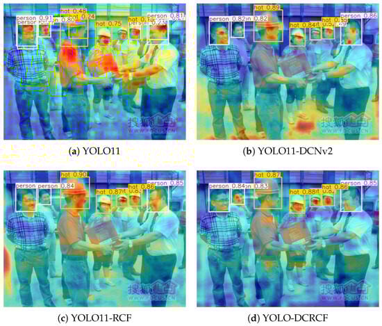 Figure 10 illustrates the heatmap comparison results of various models on the public SHWD, based on the optimal weights obtained during training. The comparative analysis indicates that, compared with the baseline model YOLO11, the other three models successfully detected all persons and safety helmets. Despite retaining object detection capabilities, the YOLO11-DCNv2 model exhibited abnormally dispersed heatmap responses, with insufficient feature focus in critical regions such as helmets. The YOLO11-RCF model demonstrated enhanced feature extraction capability, and its heatmap distribution was relatively concentrated, though some activation still spread into non-target areas. A comprehensive comparison shows that the YOLO11-DCRCF model exhibited a distinct advantage in heatmap visualization; its feature activations were highly focused on the target head region (safety helmets), with the least amount of noise responses spreading to irrelevant regions, suggesting optimal performance in both object localization accuracy and feature representation capacity.
