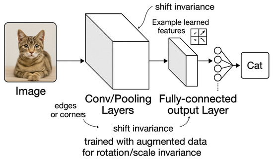 Transformers, initially developed for natural language processing, introduced self-attention mechanisms that dynamically weighted input patches based on global context [20]. Vision transformers (ViTs) achieved state-of-the-art performance by treating images as sequences of patches, but their invariance mechanisms differed fundamentally from CNNs [5,20]. Unlike convolutional inductive biases, ViTs relied on learned positional embeddings, raising questions about their robustness to geometric distortions. Recent studies highlight that while CNNs exhibit local translational invariance, their global invariance remains imperfect, with small pixel shifts sometimes drastically altering predictions [5,21]. In Figure 2, a simplified portrayal of how image invariances are handled in deep learning is shown.