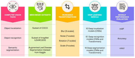 The proposed approach is illustrated in Figure 3. Three key computer vision tasks are examined: object localization, object recognition, and semantic segmentation. For each task, a benchmark dataset is selected, and four invariance transformations are applied to images, towards evaluating, through targeted performance metrics, the robustness of 10 different deep learning models for each task, to applied invariances.