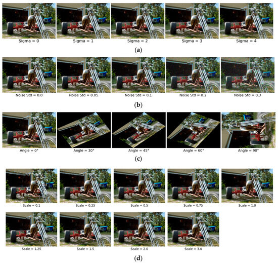 Figure 4 includes indicative visualizations of an image passing through different levels of blur (Figure 4a), Gaussian Noise (Figure 4b), Rotation (Figure 4c), and Scaling (Figure 4d). Note that the figures are provided for reference and do not depict all possible scales of invariances.