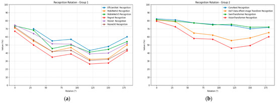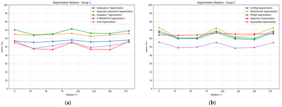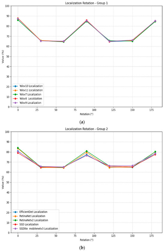 To evaluate the robustness of the models under rotation transformations, we systematically applied controlled image rotations to the datasets. For each selected image, a series of rotations was performed at fixed angular intervals, specifically from 0 to 330 degrees. Yet, it should be noted that for the experiments, only up to 180 degrees were used, since beyond this range, the same results are mirrored, offering no additional insights. Moreover, inclusion of redundant degree points would significantly increase the models’ runtime without further contributing meaningful results. The rotation was applied using a standard 2D affine transformation centered at the image midpoint. To ensure that the entire rotated image content was preserved within the frame, the dimensions of the output image were adjusted based on the rotation matrix to accommodate any spatial expansion resulting from the transformation.