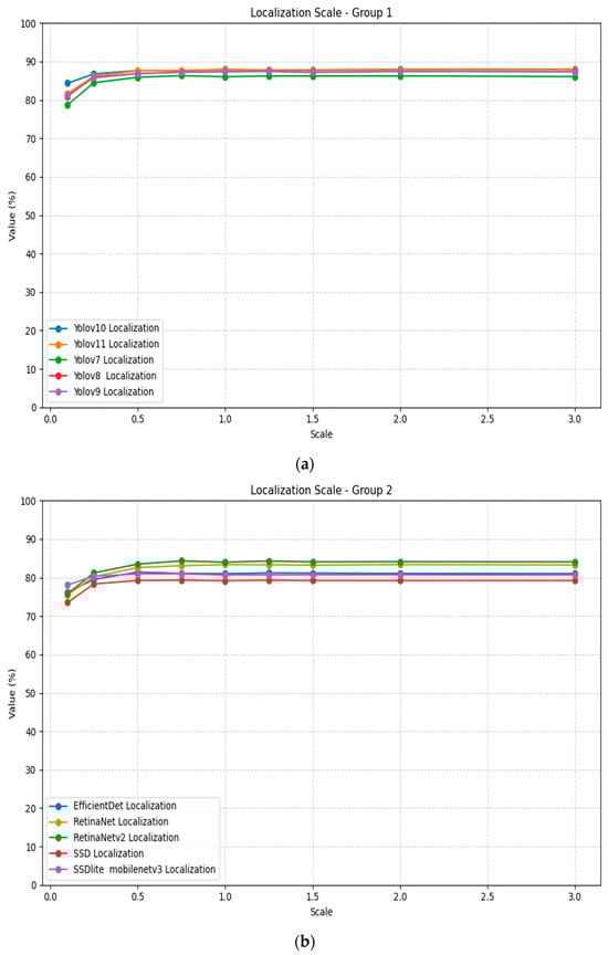 To evaluate the scale invariance of the models, we conducted a series of controlled image resizing operations on the datasets. Each image was rescaled using a range of predefined scale factors: 0.1, 0.25, 0.5, 0.75, 1.0 (original resolution), 1.25, 1.5, 2.0, and 3.0. The scaling was performed using bilinear interpolation via OpenCV’s resize function, ensuring consistent image quality across resolutions.