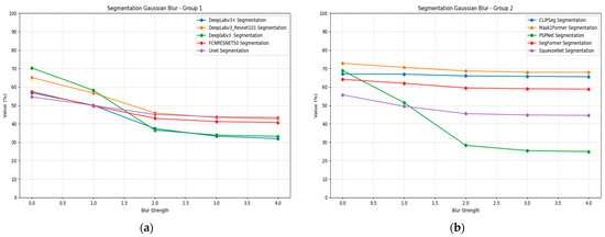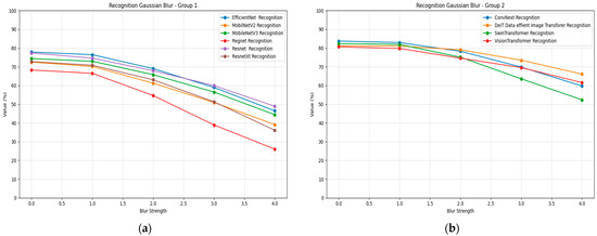 To assess the robustness of the models under image blur distortions, we applied Gaussian blurring at multiple levels to a fixed subset of images from the dataset. The blurring was implemented using a Gaussian kernel of fixed size (5 × 5), with the degree of blur controlled by varying the standard deviation (σ, or sigma) parameter. Specifically, we evaluated blur invariance across five sigma values: σ = 0 (no blur), 1, 2, 3, and 4. The application of Gaussian blur was performed using OpenCV’s GaussianBlur function, with identical values for both sigmaX and sigmaY to ensure isotropic smoothing.