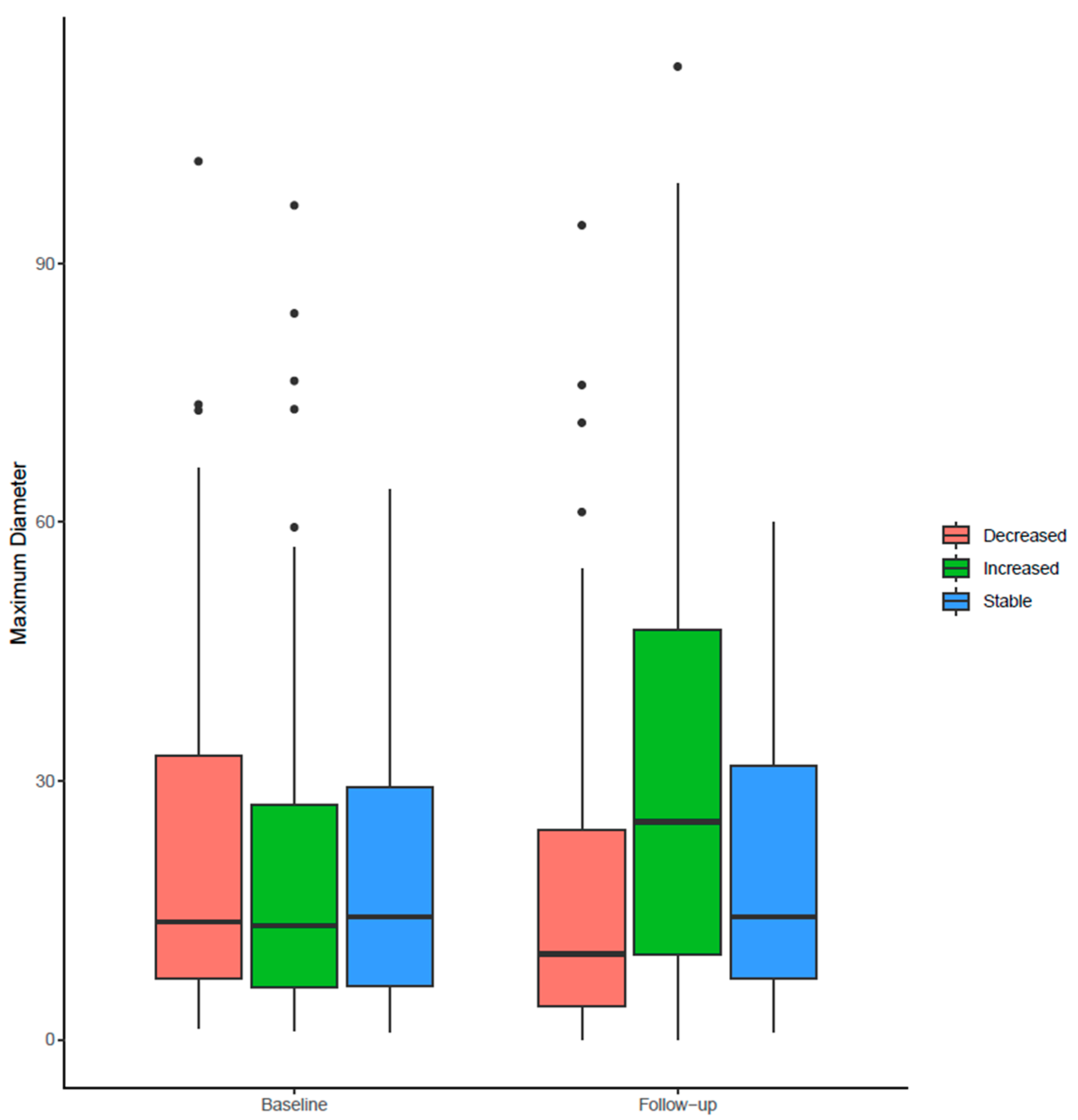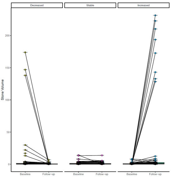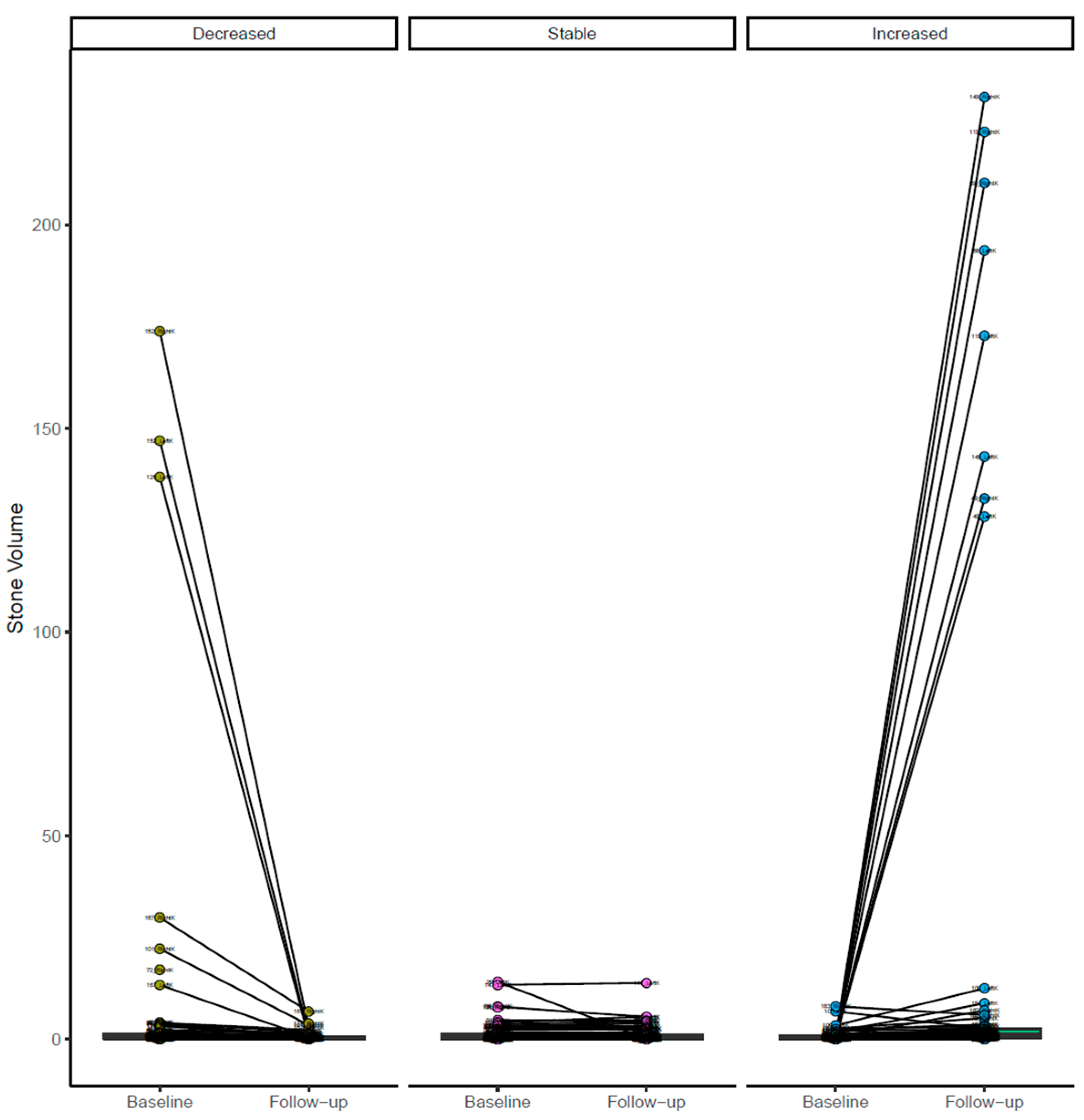 The decision regarding stone burden change or stability was based on segmented volumes of stones obtained separately for each kidney on baseline and follow-up CT examinations. A change in stone volume of less than 15% was regarded as evidence of a stable stone burden, whereas a greater than 15% increase or decrease in stone volume upon follow-up CT was deemed to indicate an increased or decreased stone burden [