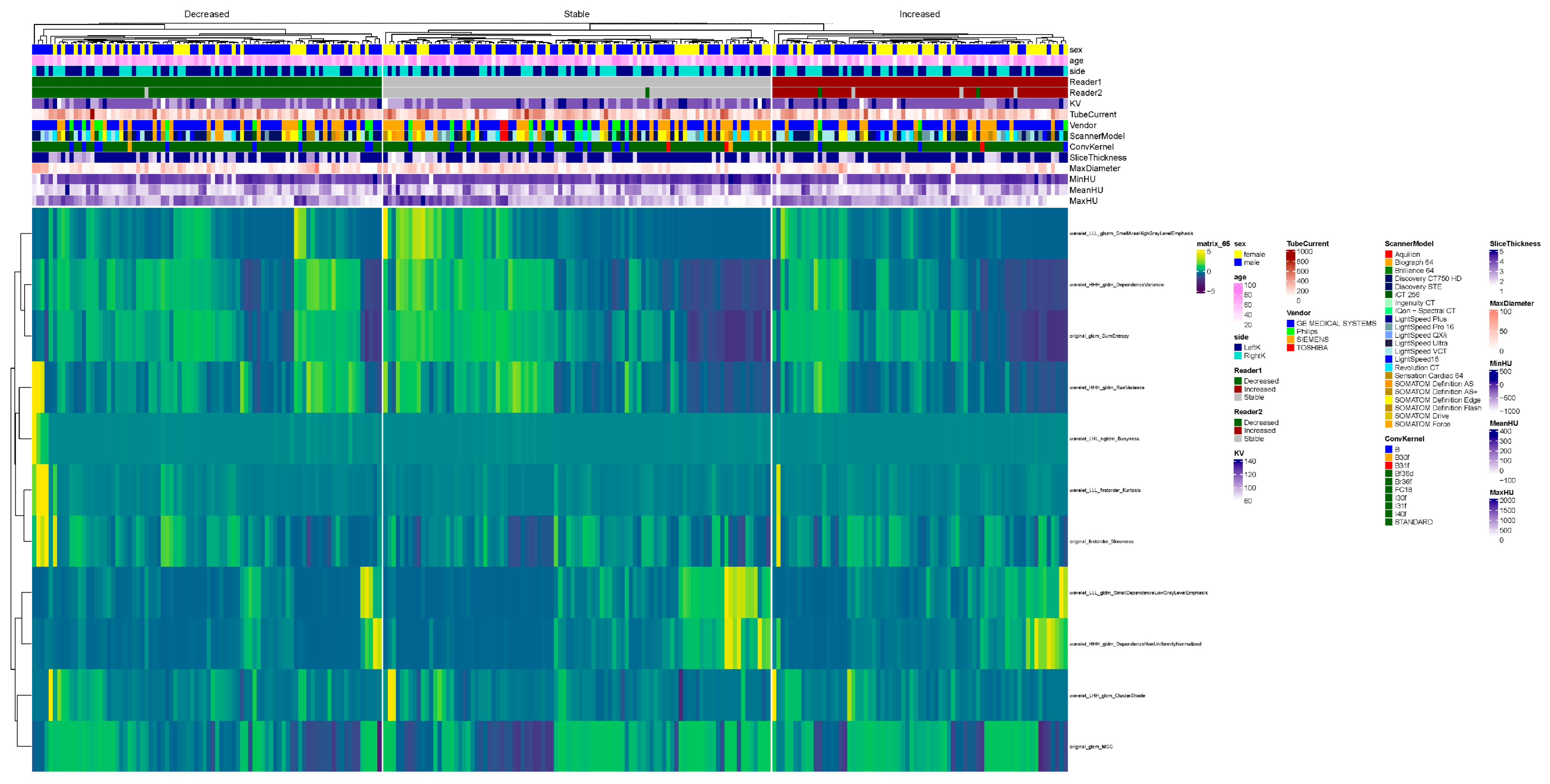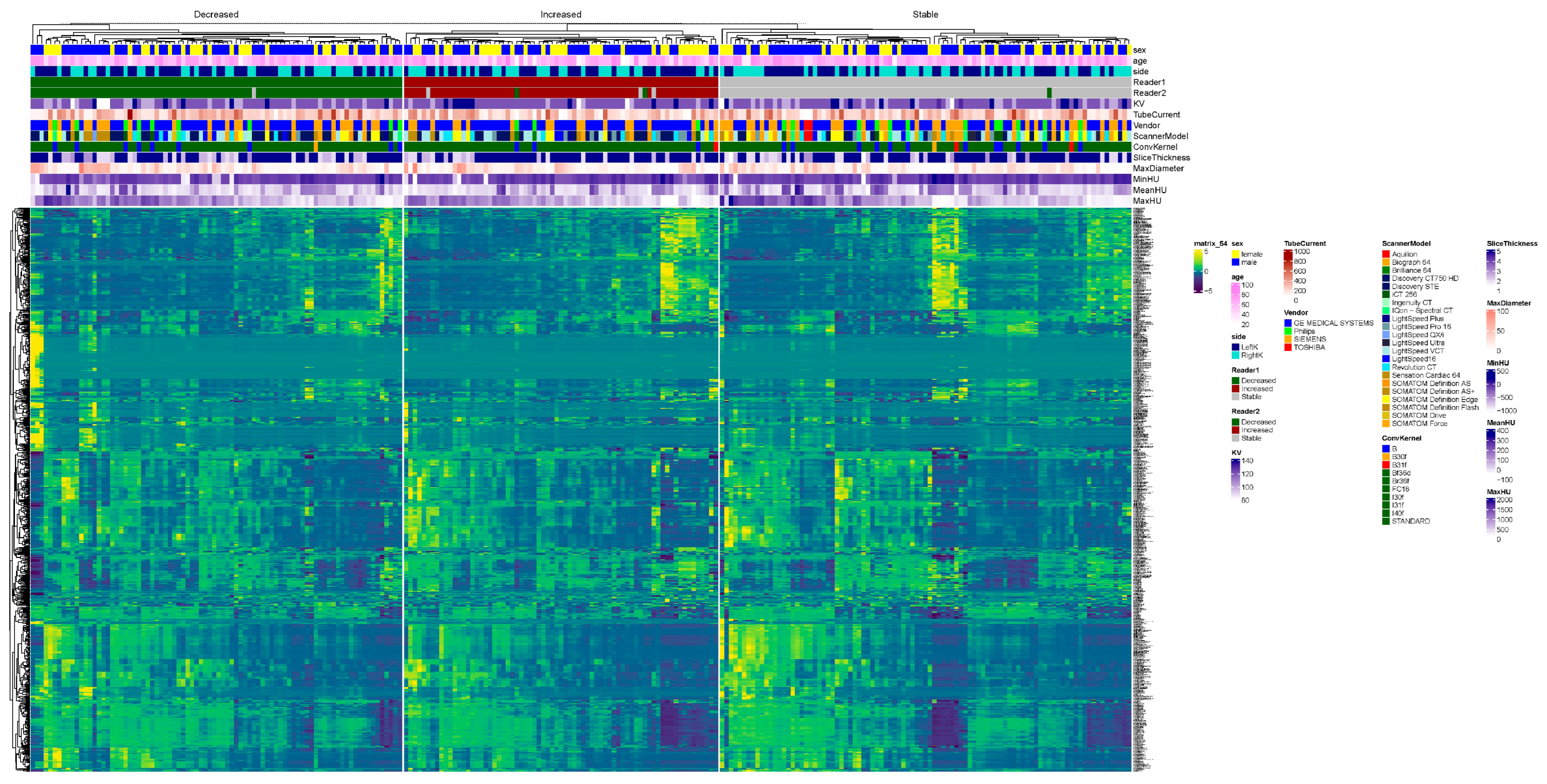 For summary statistics, the tableone package (version 0.13.2) was utilized. For the comparison of means, a Student’s t-test was performed. For the comparison of categorial variables, the chi-squared test was performed. For the visualization of data in boxplots, ggplot2 (version 3.4.1.) was used. Furthermore, the visualization of all radiomics features in a heatmap was performed with the ComplexHeatmap package (version 2.14.0), utilizing hierarchical clustering. The normalization of data was performed with z-score normalization.