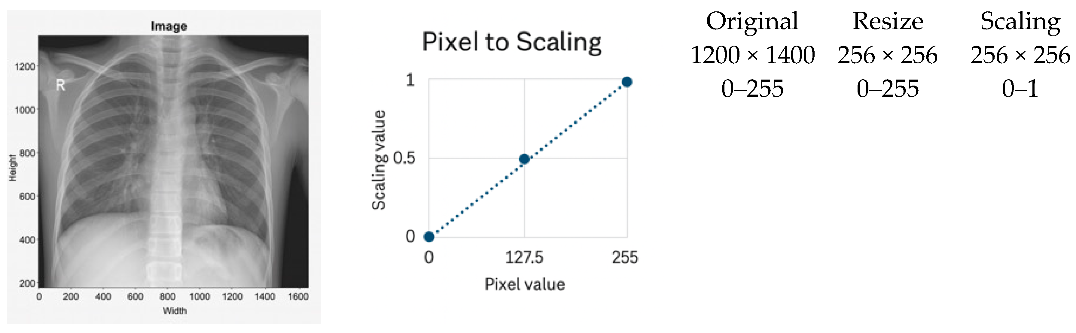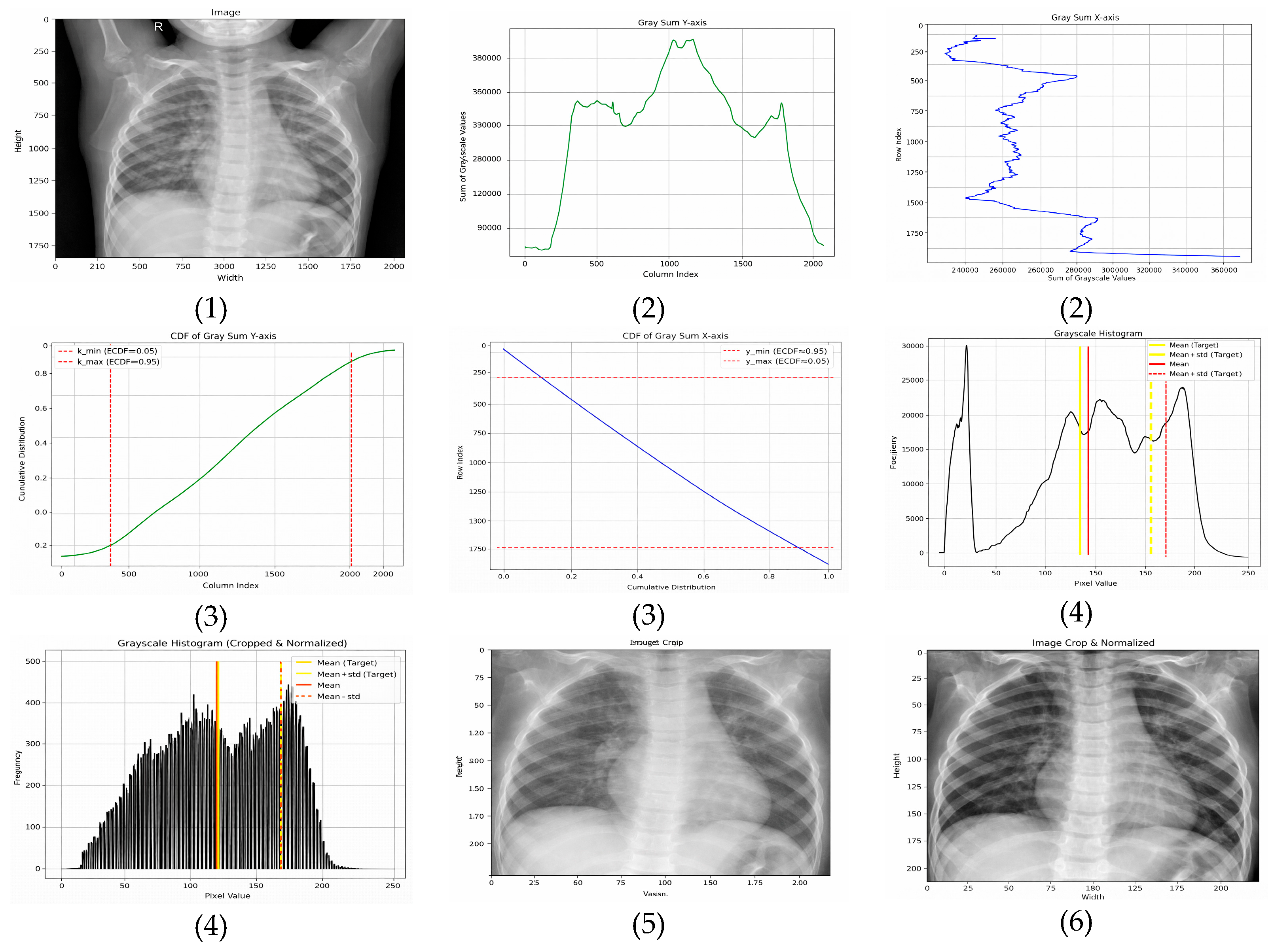 - Horizontal (x-axis)—The ROI is extracted between the 5th and 95th percentiles, removing low-density lateral regions that predominantly contain background. This range is selected based on empirical consistency across adult and pediatric CXRs and aligns with findings that lateral regions contribute minimal diagnostic information.