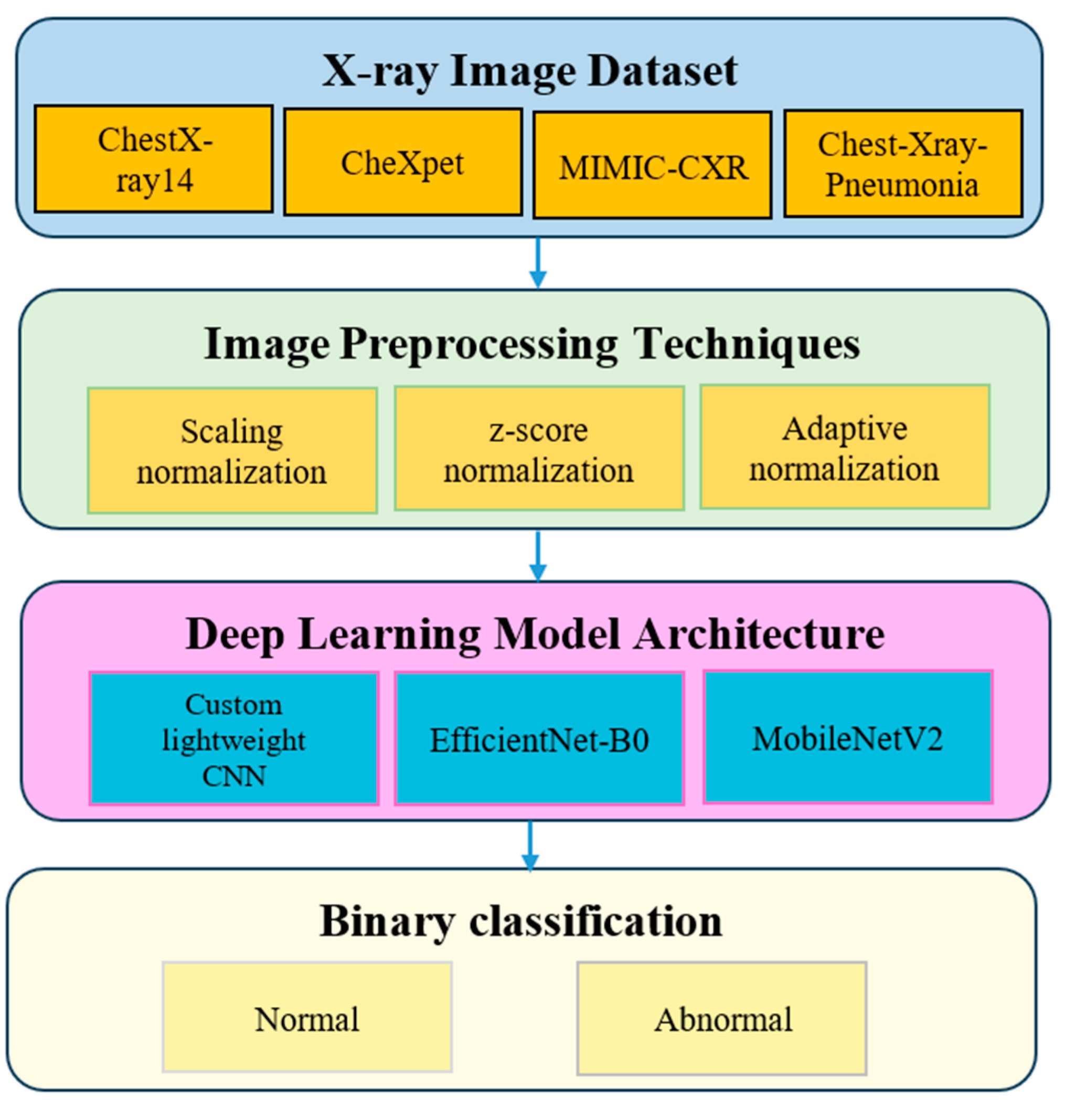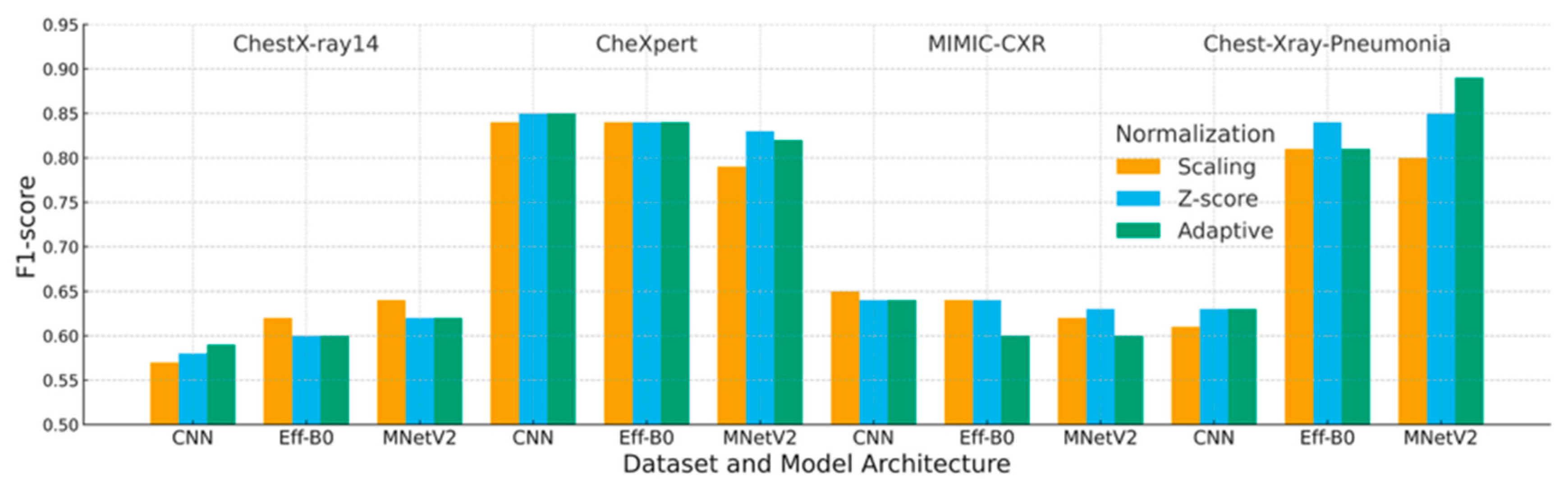 | This Study | CNN, EfficientNet-B0, MobileNetV2 | Adaptive normalization (CDF cropping + histogram standardization) | CXR14, CheXpert, MIMIC-CXR, Pediatric | Accuracy, F1 | A systematic cross-dataset, cross-architecture benchmarking of normalization strategies under controlled sampling. | |||||