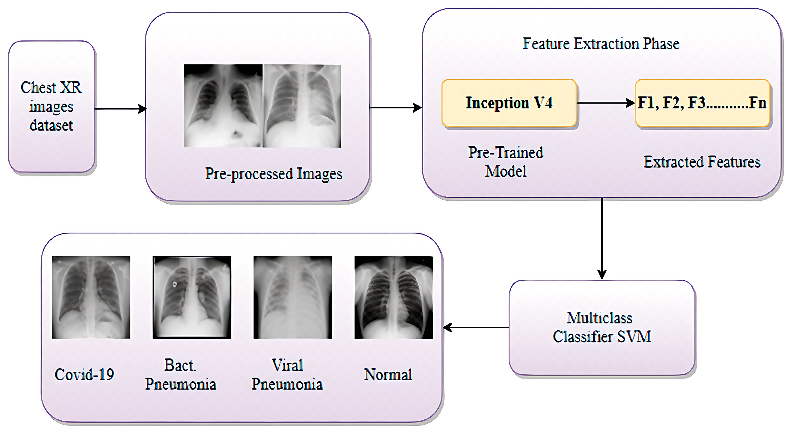 | Kaur et al. [79] | COVID-19 diagnosis from chest X-ray images | InceptionV4, multiclass SVM classifier | Chest X-ray images | Accuracy: 96.24% (four classes) | Needs larger datasets; potential observer variability in manual diagnoses |