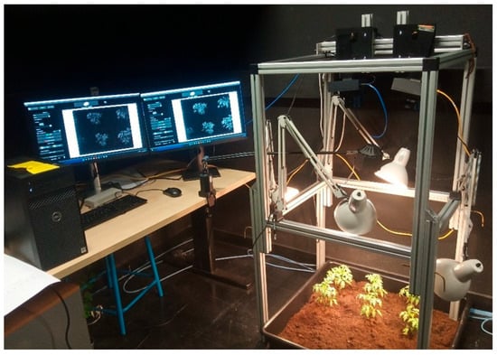 The development of the cameras was performed in the PImRob platform of ImViA (Image et Vision Artificielle) laboratory of the Université de Bourgogne Europe. The acquisition system consisted of two MS cameras covering VIS and NIR (Figure 1). The cameras capture 16 spectral bands (i.e., 8 bands for each) from 380 to 720 nm and from 680 to 950 nm for VIS and NIR, respectively. The acquisition set-up consisted of the cameras placed beside each other and three halogen lamps placed around the cameras. The cameras were controlled simultaneously by two software interfaces. The images have been saved in TIF format with a resolution of 1280 × 1024.