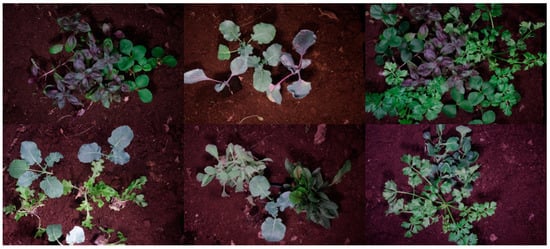 The database includes MS images of four plants (i.e., tomato, cucumber, garden bean, and bell pepper) and five weed species (i.e., bindweed, edible sedge, Plantago lanceolata, potentilla, and sorrel). The plants were freshly imported to the lab for image acquisition. The plants were displaced by their root to the imaging scene. This could keep them healthy during image acquisition. Figure 2 represents several color examples of the scene. The database includes different arrangements of plants with sparse or dense imaging scenes.