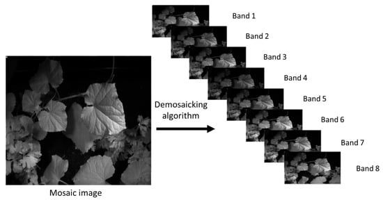 The image taken by the MS camera is a single-layer image providing reflective information in different spectral bands. For the reconstruction of images of each spectral band, it is necessary to extract the spectral information of each band and find the missing values. MS image demosaicking is a method that estimates missing pixels in different spectral channels of the mosaic image. This was performed using the bilinear demosaicking technique in MATLAB software (R2018b, the US). The reconstructed images are the same size as the original images.
