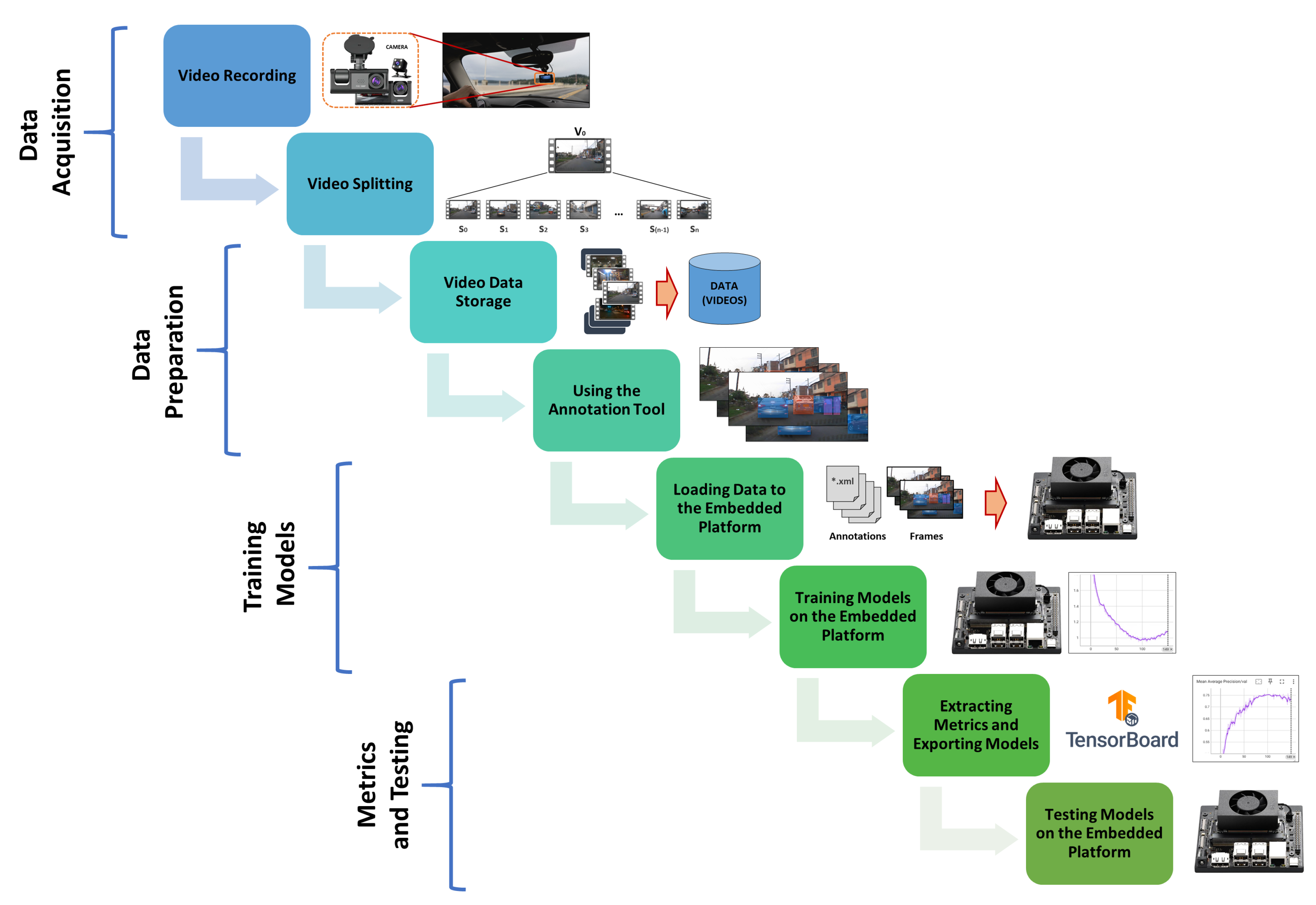 The process shown in Figure 1 consists of the following steps. i. Video Recording: Vehicles are captured in a traffic environment using a dashcam mounted on a vehicle. ii. Video Splitting: Information of interest is extracted and the videos are segmented to facilitate data labeling. iii. Video Data Storage: The selected video segments are aggregated to generate video data ready for annotation. iv. Using the Annotation Tool: Manual labeling is performed using bounding boxes and identifying the classes involved in each frame of the videos. v. Loading Data to the Embedded Platform: The annotations performed and exported in Pascal-VOC format as *.xml files and the extracted video frames in *.png format are loaded onto the Jetson. vi. Training Models on the Embedded Platform: Three models based on SSD as the backbone are re-trained on the embedded platform. vii. Extracting Metrics and Exporting Models: *.tfevents Files are extracted for interpretation using TensorBoard and visualizing metrics such as Average Precision (AP) for each class and mAP, which is the average across classes, in addition to generating *.onnx files for each trained model. viii. Testing Models on the Embedded Platform: DetecNet is used to load the exported models and object detection tests are performed on the Jetson.