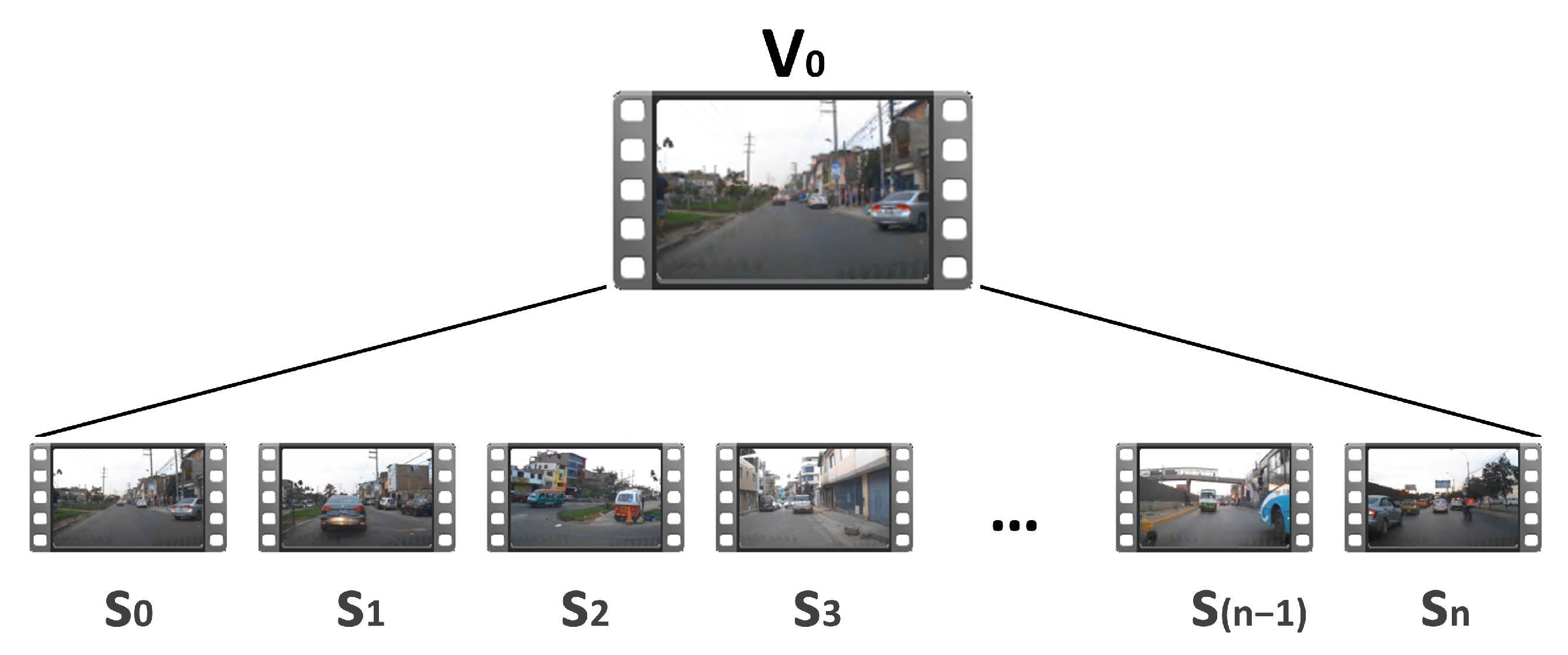The captured videos have been segmented, as shown in Figure 3. The recordings obtained during the urban route consist of videos with a duration of 3 min, comprising a total of n + 1 video segments, with each segment having a duration of t f seconds and containing m frames per second. For example, in Figure 3, video V 0 is composed of segments V 0 = S 0 + S 1 + S 2 + + S n .