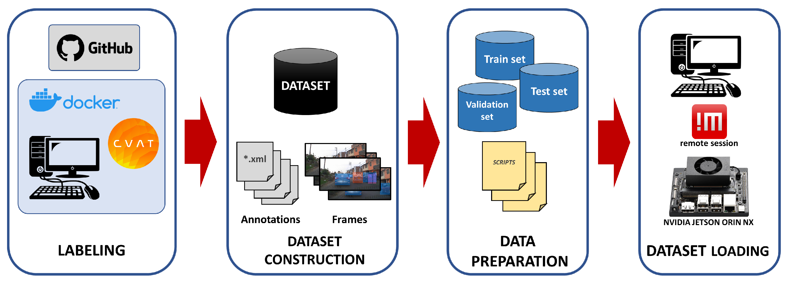The diagram in Figure 5 consists of four stages: i. Labeling—annotation using the CVAT annotation tool on a computer using Docker; ii. Dataset Construction—exporting the images and annotations for each image; iii. Data Preparation—segmenting the data to obtain three datasets: training, validation, and test; iv. Dataset Loading—importing the data onto the embedded platform using a remote access tool (NoMachine) to the Jetson to facilitate file upload or download.