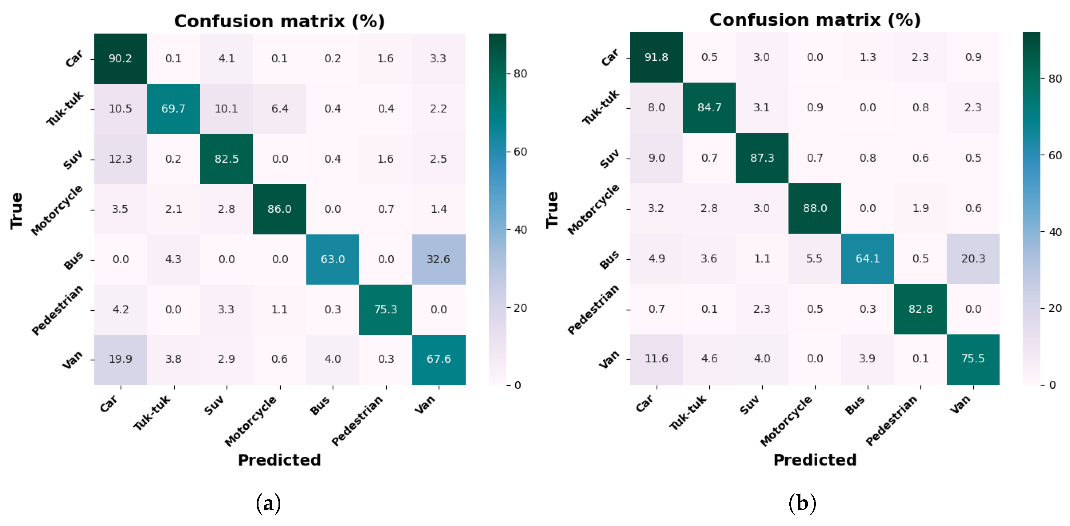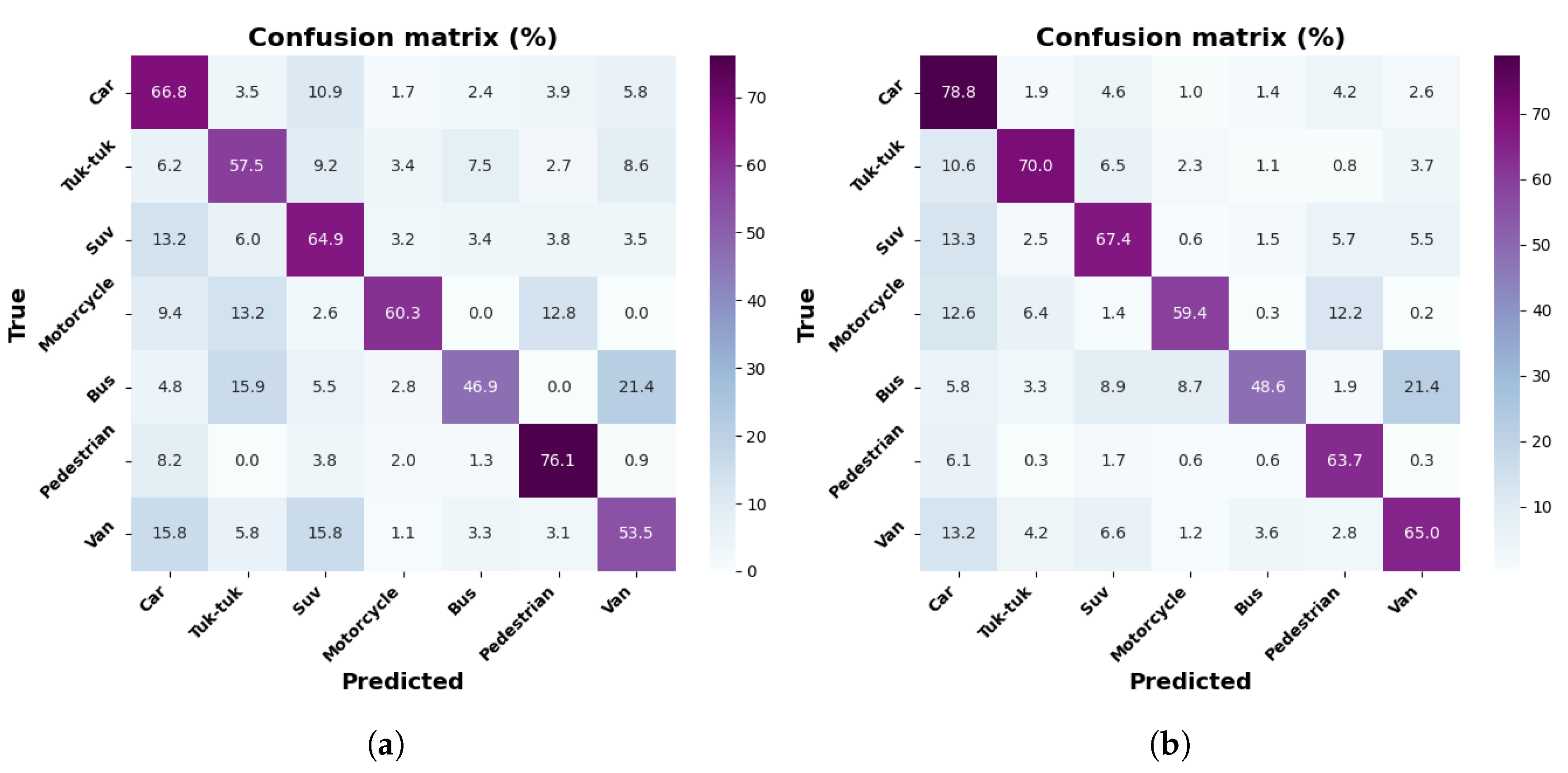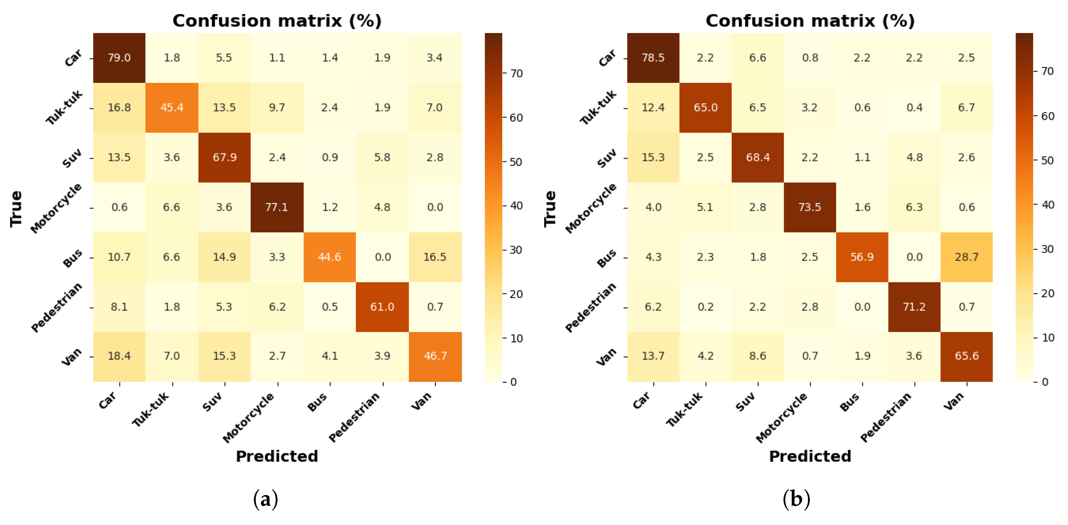 Figure 12a,b show row-normalized confusion matrices for the MobileNetV2-SSD-Lite model, with the collected dataset and the dataset with increment through contrast adjustment. The results indicate an improvement with data increment, notably in the Tuk-tuk class, with an increase of up to 12.5%, according to the percentages reported in the matrices for all classes, with the exception of the Suv and Pedestrian classes. The most significant class achieves 78.8% for the Car class, with the dataset of 9000 images.