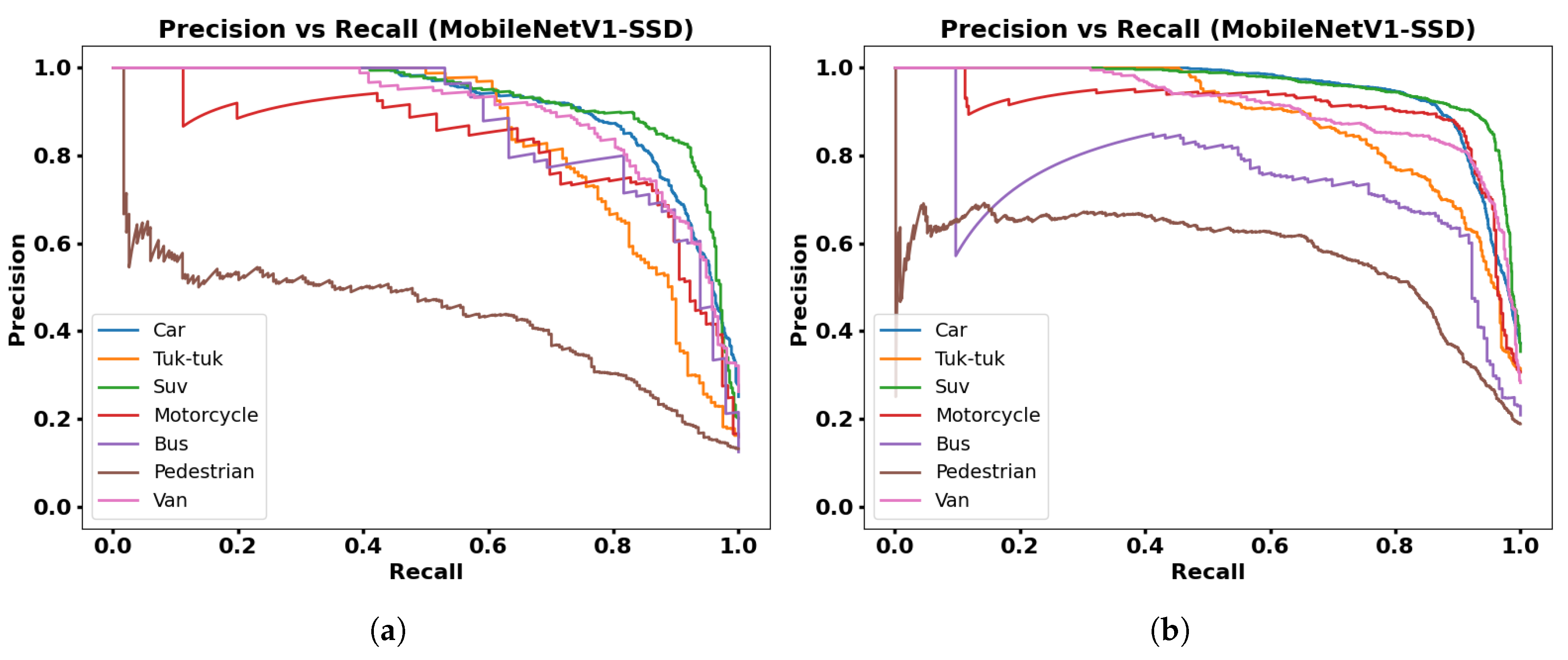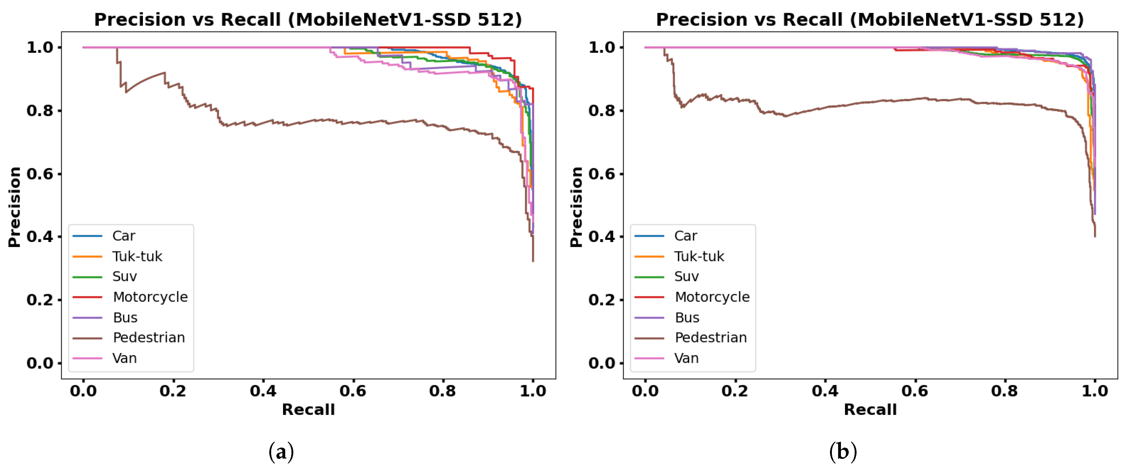 Figure 18. Results with MobileNetV1-SSD model (512 × 512): (a) Precision vs. Recall with 3000 frames dataset; (b) Precision vs. Recall with 9000 frames dataset.