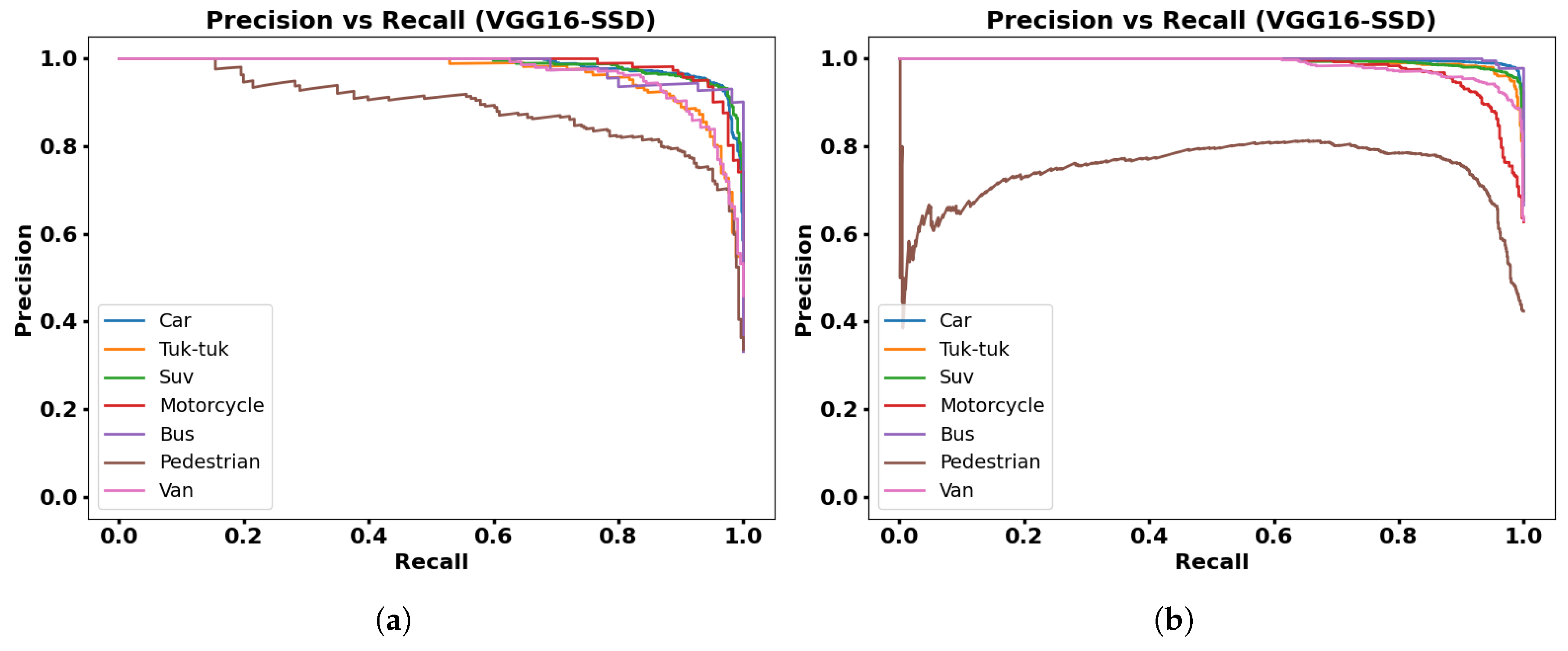 Figure 15, Figure 16, Figure 17 and Figure 18 show PR graphs for the MobileNetV1-SSD, MobileNetV2-SSD-Lite, VGG16-SSD, and MobileNetV1-SSD (512 × 512) models, respectively. Additionally, subfigure (a) in all figures shows results using the collected dataset of 3000 images, while subfigure (b) shows results with the augmented dataset (9000 images) through contrast adjustment.