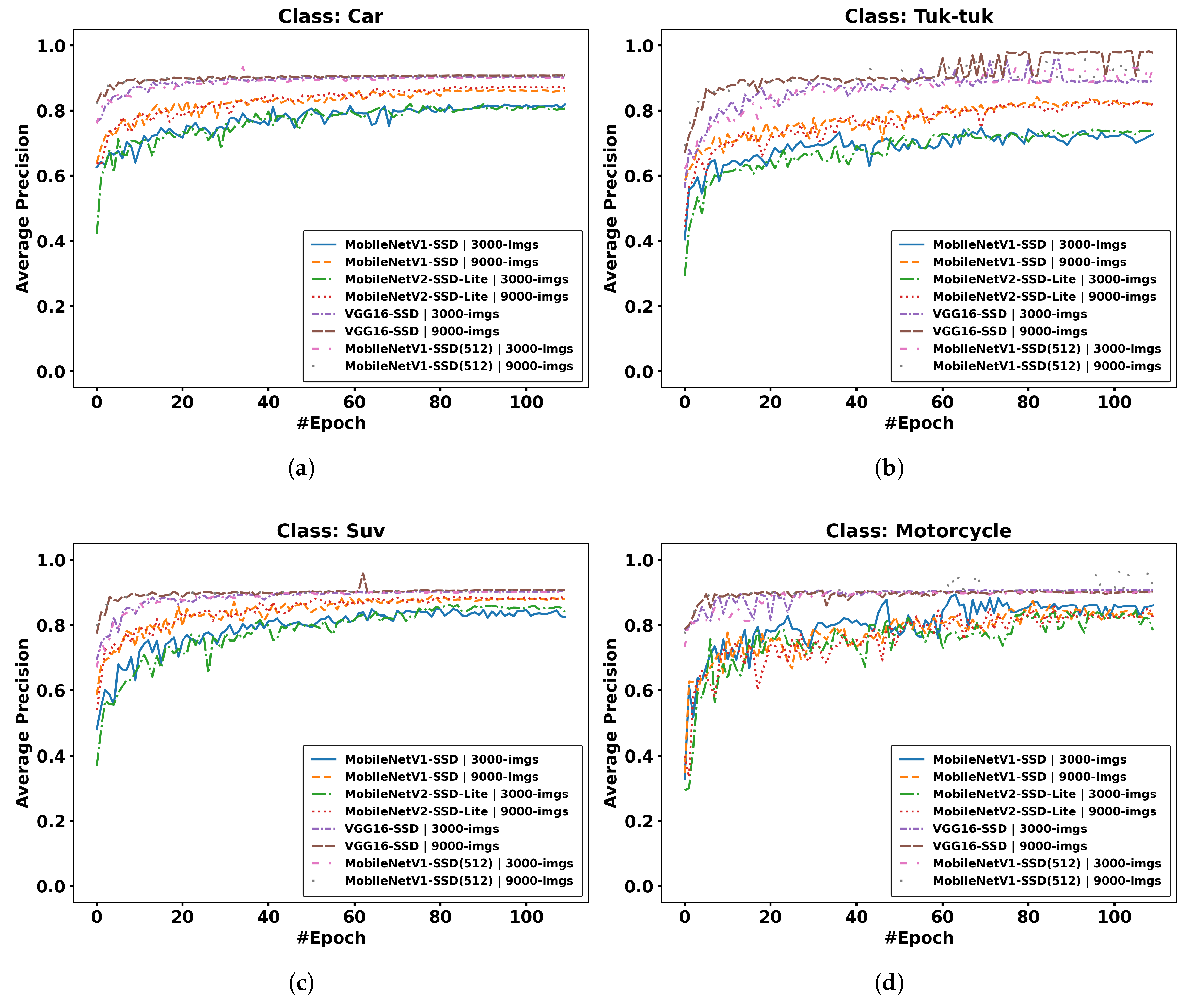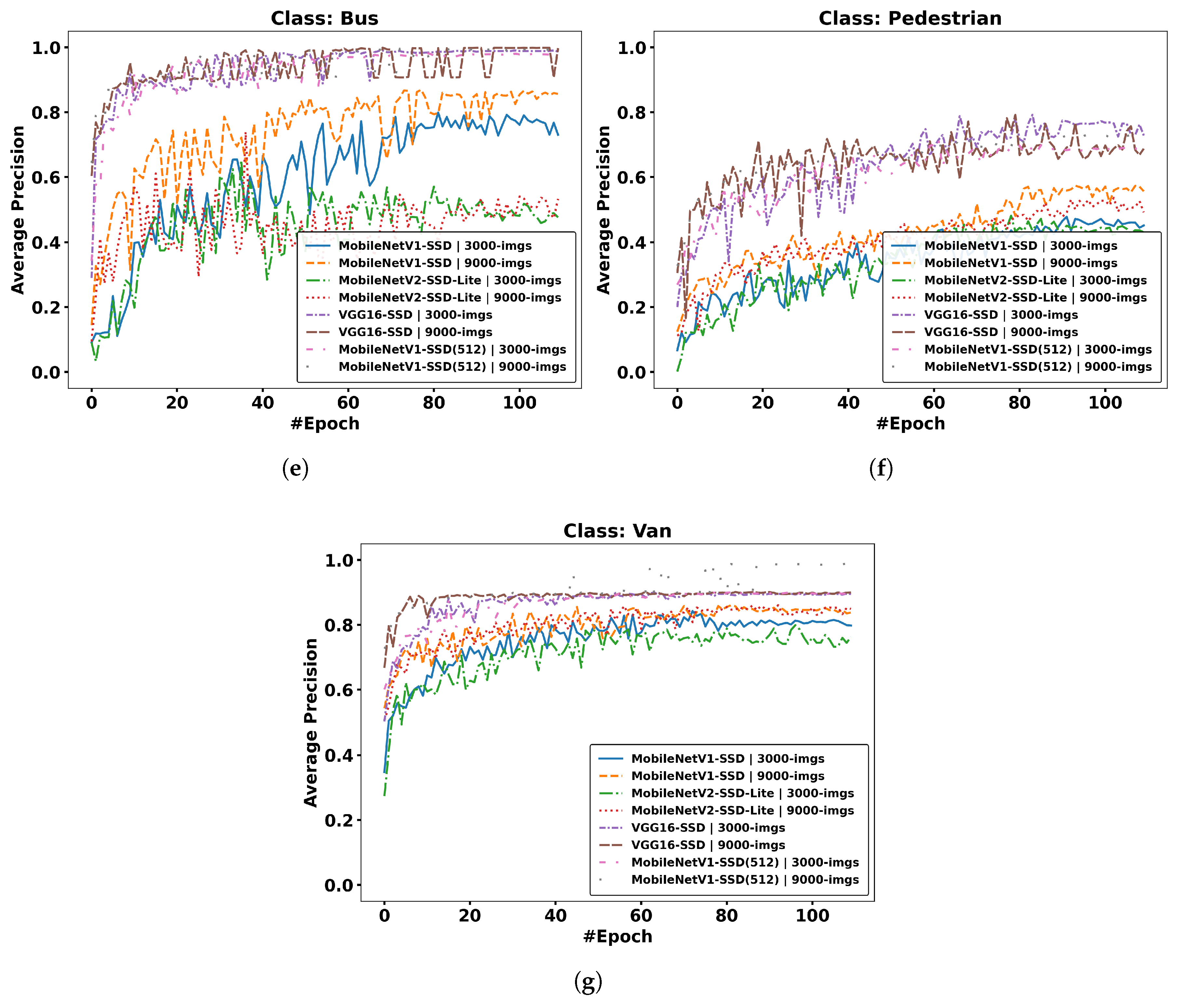 Figure 19. Results per class, Average Precision vs. epoch: (a) Car; (b) Tuk-tuk; (c) Suv; (d) Motorcycle; (e) Bus; (f) Pedestrian; (g) Van.
