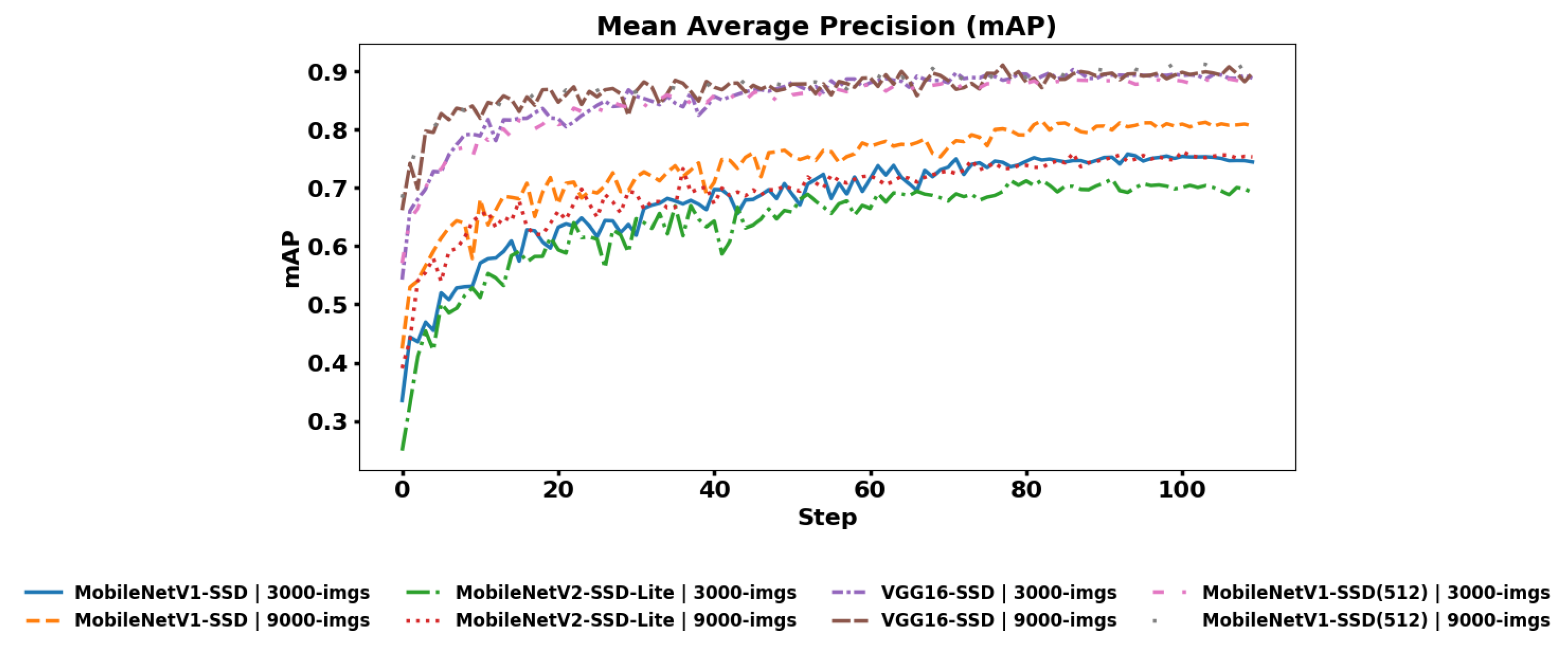 It is worth noting that for the resolution argument, the value of 300 × 300 was used for all three models, and the value of 512 × 512 was only used for the MobileNetV1-SSD model reported in the results section.