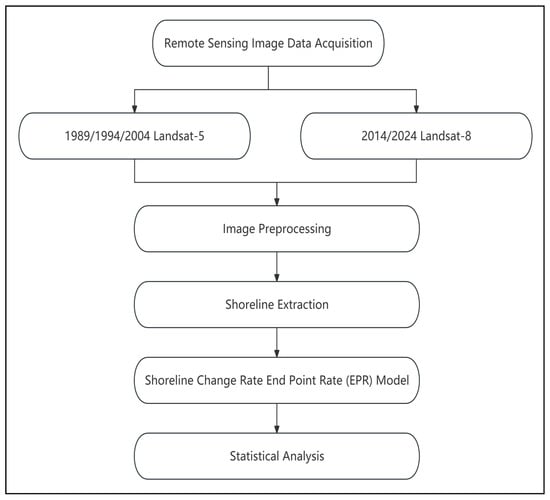 Multi-temporal satellite imageries of Landsat 5 TM (manufactured by Hughes Aircraft Company, Los Angeles, California, USA) and Landsat 8 OLI (manufactured by Ball Aerospace & Technologies Corporation, Boulder, Colorado, USA) sensors (Table 1) have been utilized for the study area in 1989, 1994, 2004, 2014, and 2024, with a spatial resolution of 30 m and an acquisition interval of 5–10 years. To highlight the water-land boundary lines, a pseudo-color synthesis method was adopted. Specifically, the near-infrared, red, and green spectral bands were, respectively, assigned the colors red (R), green (G), and blue (B), and a pseudo-color synthesis was performed. Additionally, appropriate linear stretching was applied to enhance the visibility of the water-land boundaries. The Bangkok Bay shoreline change analysis study has followed the methodology workflow shown in Figure 2.