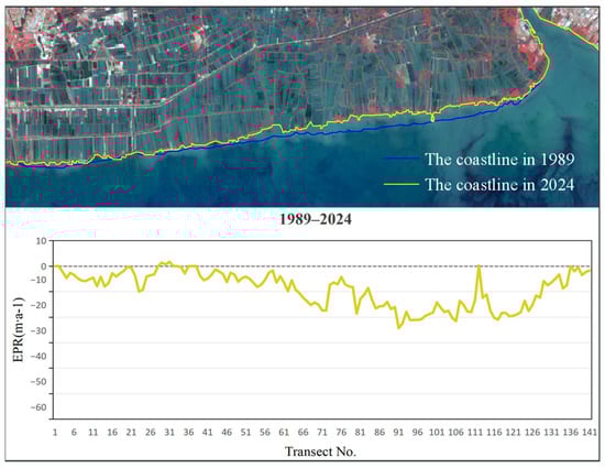 To analyze the rate of coastline, change in Bangkok Bay from 1989 to 2024, this study selected the coastal sections adjacent to Samut Sakhon, Bangkok, and Samut Prakan Provinces as the representative study segment (Figure 5). Remote sensing images were interpreted using a human–computer interactive method to extract coastline data for five distinct periods. The calculation of End Point Rate (EPR) values across all specified time intervals was conducted using uniformly spaced (200 m) transect lines set normal to the baseline (Figure 6), a method facilitating precise capture of coastline evolution through time and distinct phases. The subsequent figures (Figure 7, Figure 8, Figure 9, Figure 10 and Figure 11) present these EPR results, with the sign convention denoting accretion (positive) and erosion (negative).