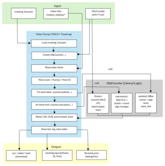 Figure 1 represents or analyzing human movements and evaluating bidirectional flow (entries and exits) in video sequences. It is implemented by integrating a YOLO-based object detection model and tracking algorithms. The system accepts structured input data such as video streams, YOLO model weights, and line intersection parameters, and generates annotated video files, structured event logs, and diagnostic information in the terminal.