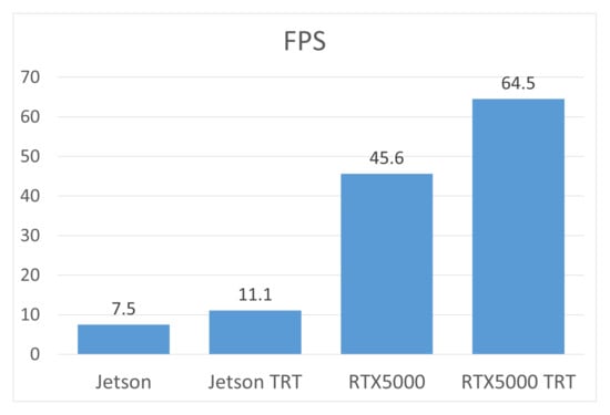 To evaluate the performance of the algorithm, a series of tests was conducted on two hardware platforms—Jetson Nano and NVIDIA RTX5000. The tests were carried out both with and without TensorRT optimization, which allowed to determine the impact of faster calculations on the overall performance of the model. The results shown in Figure 14 demonstrate that using TensorRT can significantly reduce data processing time, especially when performing calculations on graphics processing units (GPUs). This approach ensures more efficient use of computing resources and improves the overall performance of the model. After analyzing the results obtained, the system underwent additional experimental testing under real-world operating conditions. This allowed us to confirm its reliability, stability of operation, and suitability for practical use in scenarios close to the real environment.