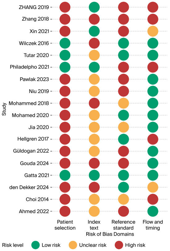 The 18 included studies were assessed in each of the four QUADAS-2 domains and showed a clear, recurring pattern of methodological weaknesses, concentrated in patient selection and verification methods, whereas flow/timing was generally handled well. Of the 18 included studies, 13 scored high risk in at least two domains, three scored low risk in at least three domains and will be used in the sensitivity analysis [15,22,28]. Detailed justification of the scoring is presented in the Supplementary Materials Table S3 and outlined in Figure 3.