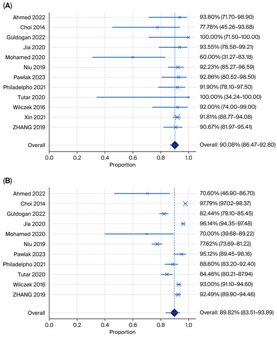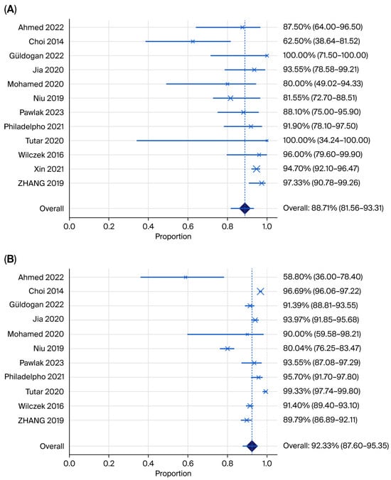Forest plot showing (A) pooled sensitivity and (B) specificity for HHUS plus mammography (Ahmed 2022 [24], Choi 2014 [21], Güldogan 2022 [29], Jia 2022 [26], Mohamed 2020 [37], Niu 2019 [31], Pawlak 2023 [32], Philadelpho 2021 [14], Tutar 2020 [28], Wilczek 2016 [15], Xin 2021 [33], Zhang 2019 [35]).